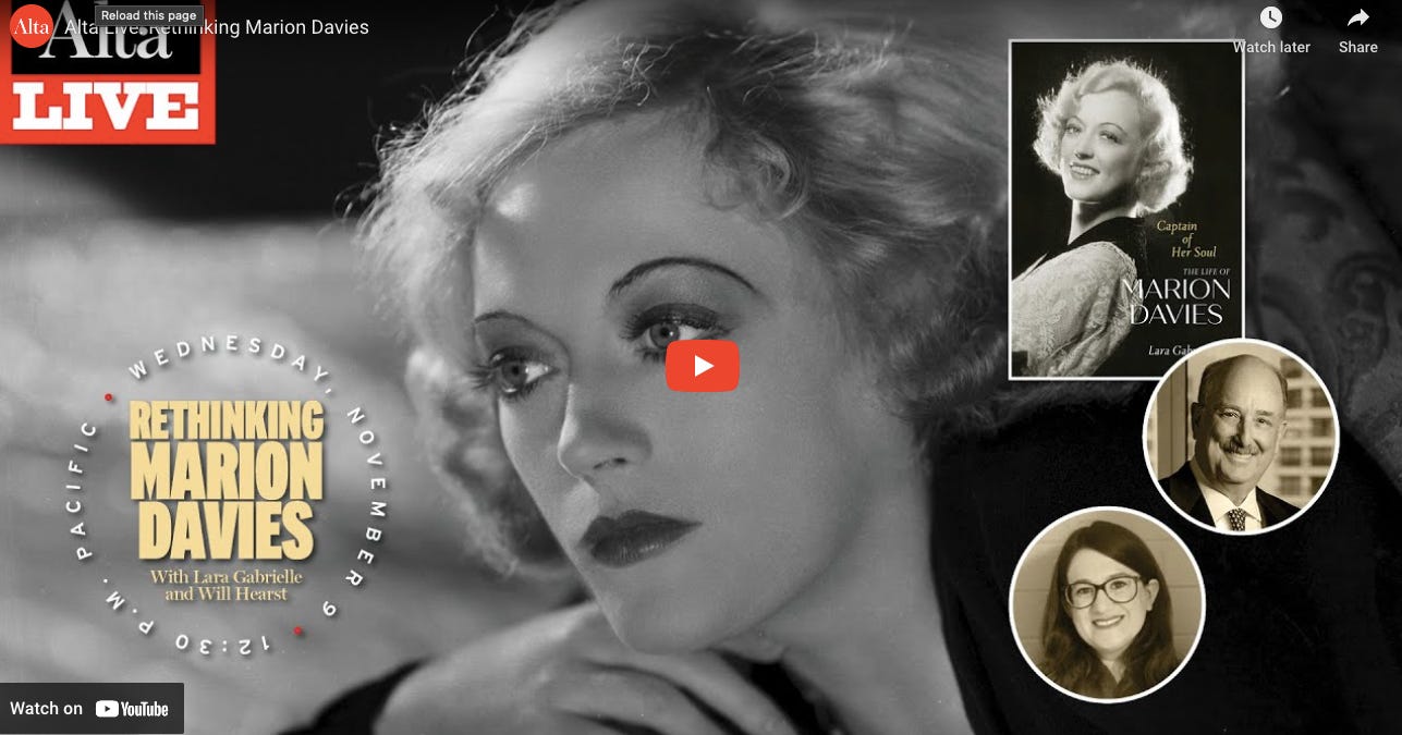 Grandson, Will Hearst, reviewed Lara Gabrielle’s new biography (published in 2022), “Captain of Her Soul: The Life of Marion Davies.”